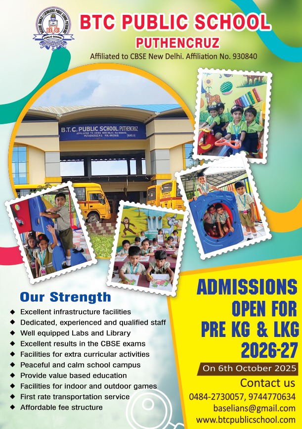 BTC Public School located near PUTHENCRUZ in, Ernakulam is a co-educational institution. It has Classes from Kindergarten to Secondary level. It is one of the best schools in Ernakulam district. The school reflects the dynamism and energy of this fast growing Indian metropolis through its exciting courses and innovative methods of teaching.BTC Public school is situated in Puthencruz as a sister concern of MAMHSS Puthencruz.
